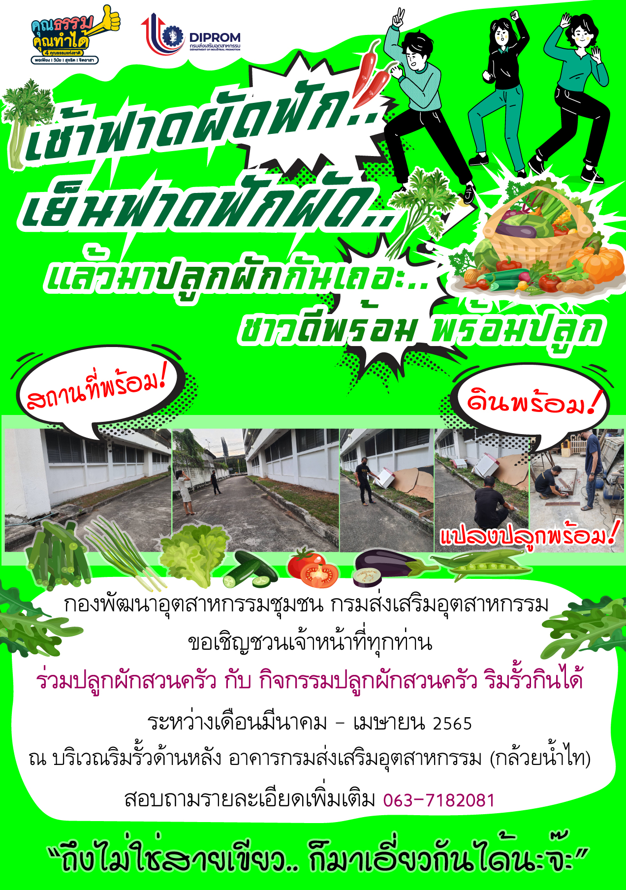 กองพัฒนาอุตสาหกรรมชุมชน กรมส่งเสริมอุตสาหกรรม ขอเชิญชวนเจ้าหน้าที่ทุกท่านร่วมปลูกผักสวนครัว กับ กิจกรรมปลูกผักสวนครัว ริมรั้วกินได้ ระหว่างเดือนมีนาคม - เมษายน 2565 ณ บริเวณริมรั้วด้านหลัง อาคารกรมส่งเสริมอุตสาหกรรม (กล้วยน้ำไท)